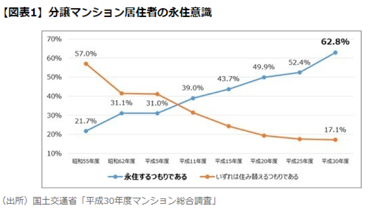 根據日本國土交通省進行的公寓綜合調查顯示,現在已有超過62.5%的日本人想把公寓作為自己最終的家。該統計每五年實施一次調查,最初的調查顯示曾有57%的人認為以后會換房子。但在將近40年的歲月里,日本人以獨門獨院一戶建為最終的家的想法已發生轉變,將公寓作為最終的家已經成為了新的目標。